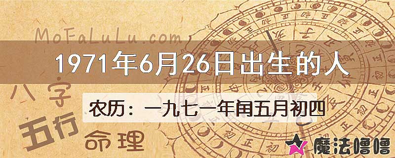 阳历1971年6月26日出生对应的农历是一九七一年闰五月初四,农历1971年出生的生肖都属猪。(十二生肖顺序:鼠-牛-虎-兔-龙-蛇-马-羊-猴-鸡-狗-猪)